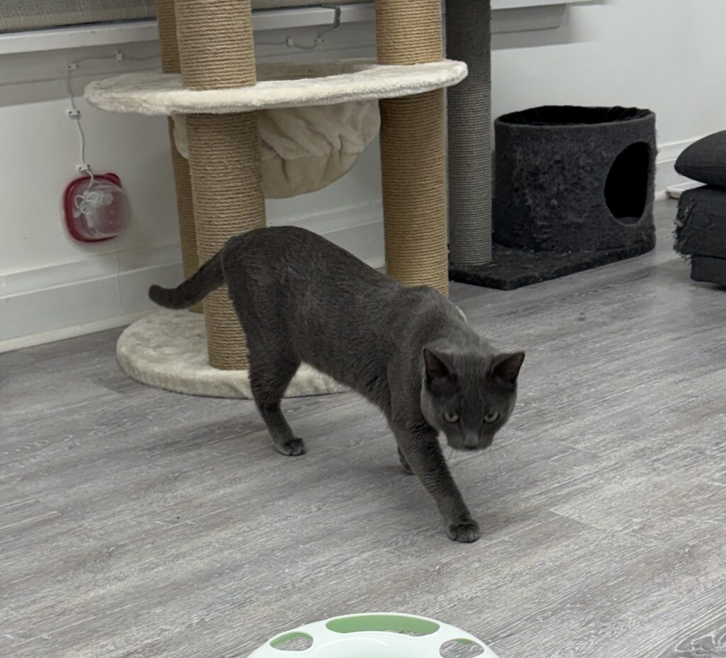 Lucifer adores food and toys – especially anything that wanders or wiggles! He loves window watching, chin rubs, and snuggling up with his favorite people. He’s still a little skittish with strangers and might let out a dramatic hiss when spooked.